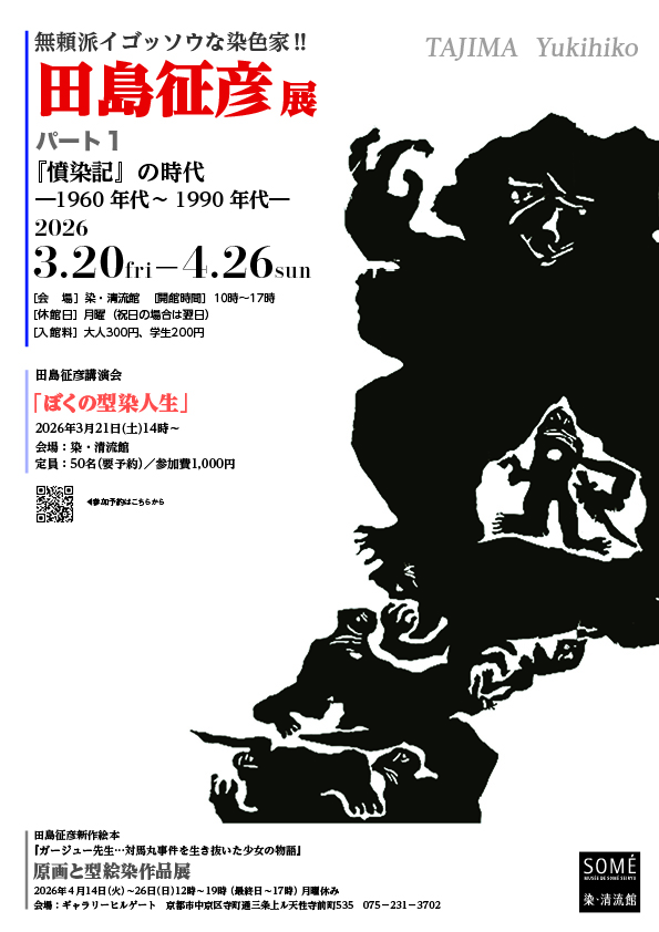 染色作家・田島征彦の、京都では初めてとなる染色作品の全貌を辿る個展を開催します。初期の作品から近作まで60年以上にわたり取り組んできた型絵染による作品を、2期に分けて展示します。 田島征彦は、1940年に大阪府堺市に弟の征三と一卵性双生児として生まれました。5歳の時に高知県の山里に移住し、自然に囲まれた少年時代を過ごします。美術の道に進もうと、京都市立美術大学(現京都市立芸術大学)染織図案専攻に入学。稲垣稔次郎、小合友之助の両巨匠が健在で、染色を学ぶには充実した時代でしたが、劇団「アトリエ座」の活動に打ち込む一方、既成の権威に反発しながら前衛的な表現を模索する学生時代でした。現在は淡路島で畑を耕しながら創作に打ち込む日々を過ごしています。 パートⅠでは、1963年に結成した「染色集団∞(無限大)に出品された民話に題材をとった黒一色で人間の躍動する姿形をとらえた「ぽんぽんぴぃぴぃこまさらさら」から、大樹の精霊、平家物語、沖縄のキジムナー、羅漢などをテーマに制作した作品を展示します。田島作品の根底には、一貫して自然への畏敬、権威への抵抗の精神と民衆の逞しい生命力がみなぎっています。 田島征彦の型絵染ワールドをご堪能ください。
